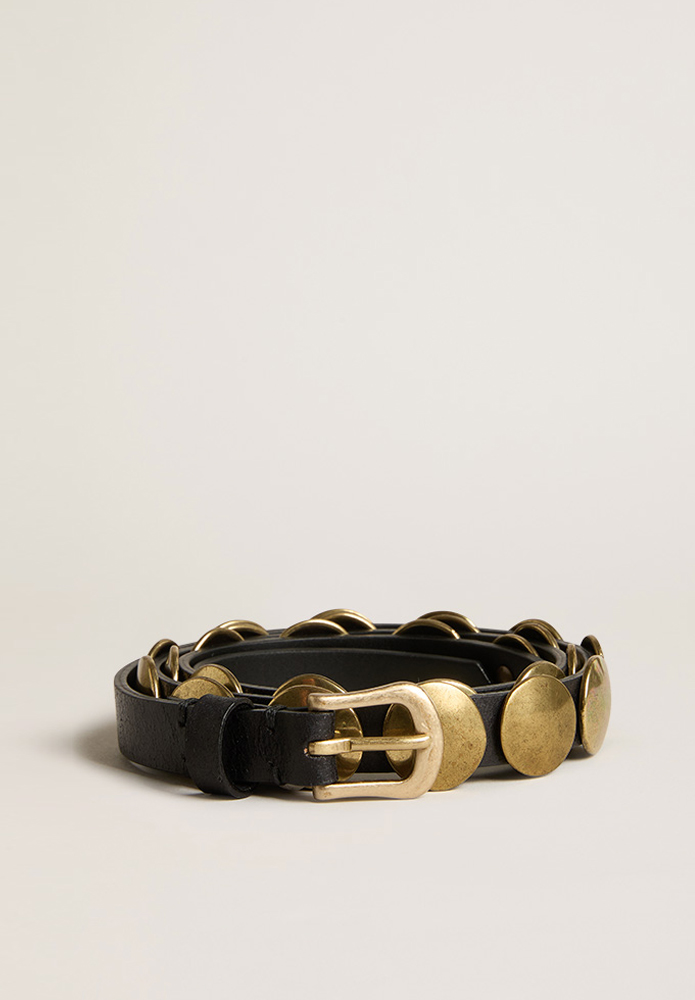 CINTURÓN BELT TRINIDAD BLACK Cinturón realizado con materiales de primera calidad, seleccionados y tratados a mano por nuestros artesanos. Este modelo realizado en piel lavada se caracteriza por las maxitachas doradas aplicadas en toda su longitud.