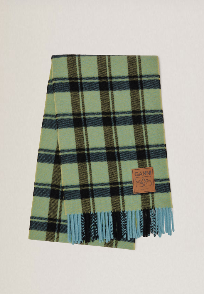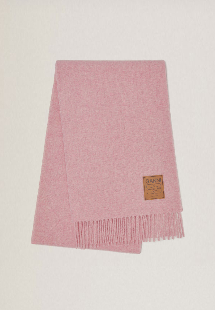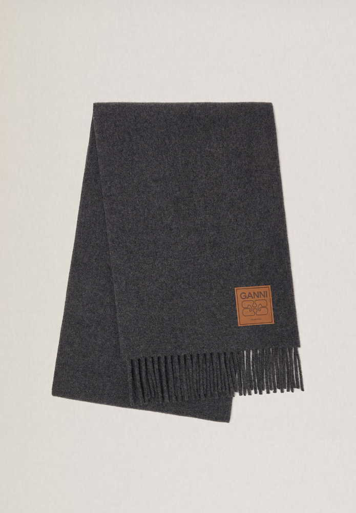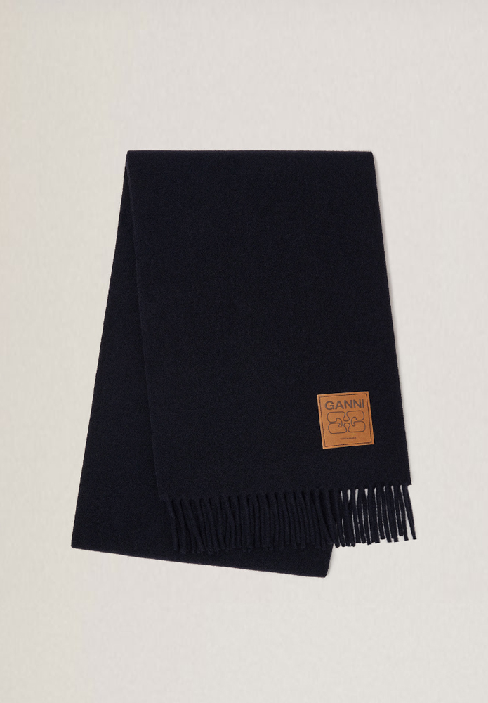 BUFANDA A6931 Esta bufanda presenta bordes con flecos y un parche con el logotipo de GANNI.