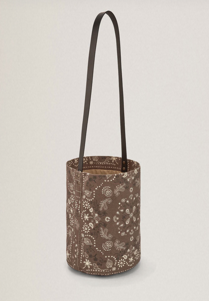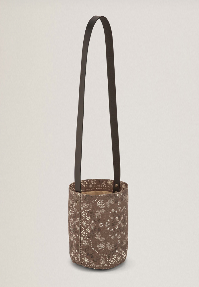 Está hecho en piel de serraje de vacuno, con base rectangular y un asa continua en forma de "U" que nace de los laterales y cierre de mosquetón en la parte superior. Forro de algodón y bolsillo interior y asa amplia para ponértelo con todo tipo de abrigo.
