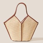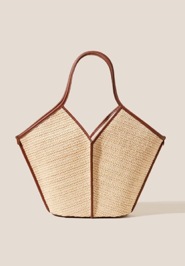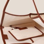 Bolso tote de HEREU de rafia con ribetes de piel y piel lisa. Tiene una bolsa con cremallera para guardar objetos pequeños y asas finas en la parte superior que se colocan sobre el hombro.