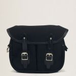 En la parte frontal del bolso, dos amplios bolsillos plisados ofrecen un amplio espacio para objetos pequeños como el teléfono, la cartera, las llaves, etc., con solapas con ribete de cuero que realzan su ya de por sí elegante bolso y un cierre de botón de latón. La solapa principal, forrada de cuero, se cierra con correas con hebilla de cuero que se desenganchan rápidamente de un cierre de botón de latón para facilitar el acceso en cualquier momento.
