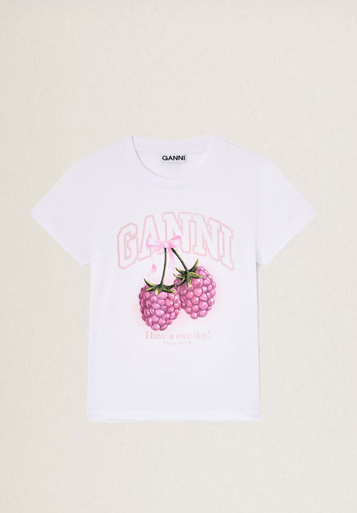 CAMISETA A1050061 Esta camiseta tiene cuello redondo, manga corta y el logo de GANNI. Luce un estampado de conejitos y el mensaje «¡Que tengas un buen día! Por favor, recicla».