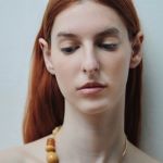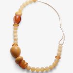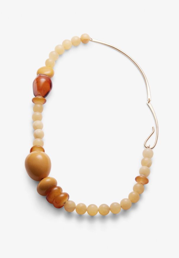 Collar ACRA de HELENA ROHNER. Una cálida combinación de cerámica, vidrio y suaves cuentas de jade en tonos ámbar. De ritmo asimétrico, con un escultural cierre chapado en oro. Suave, con un toque sobrio y un impacto sutil.