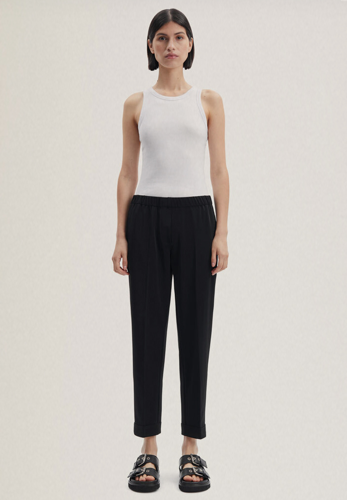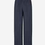 Pantalón de raso de tiro medio y corte regular. Cierre de gancho invisible y cremallera en la parte delantera. Bolsillos laterales abiertos en la parte delantera y un único bolsillo de ribete en la parte trasera. Pliegues individuales en la parte delantera. Trabillas para cinturón. Material principal fabricado 100% poliéster reciclado. Este producto tiene certificación GRS. Cada etapa de la cadena de suministro ha cumplido estrictos requisitos sociales, ambientales y químicos.