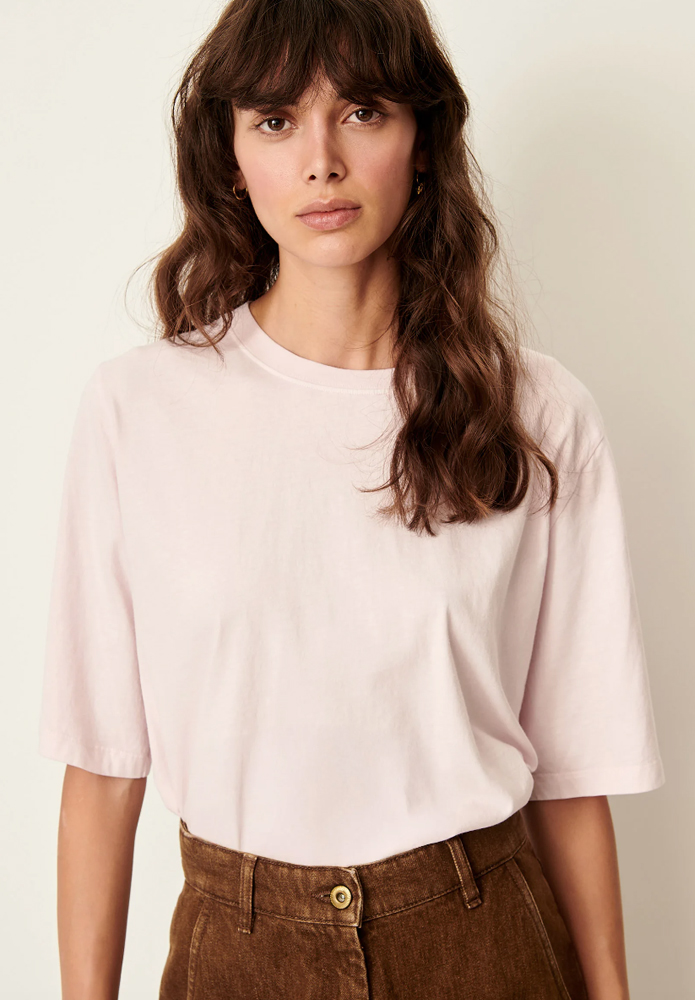 Camiseta amplia de SESSÚN en punto teñido con pigmentos, confeccionada y teñida artesanalmente en Portugal, en color ROSEE.