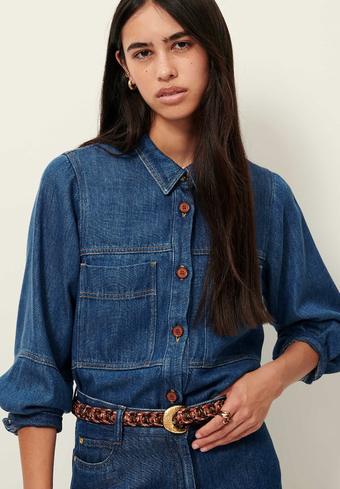 Sobrecamisa de SESSÚN de manga globo en tejido denim fluido y lavado a la piedra, tejida en España.