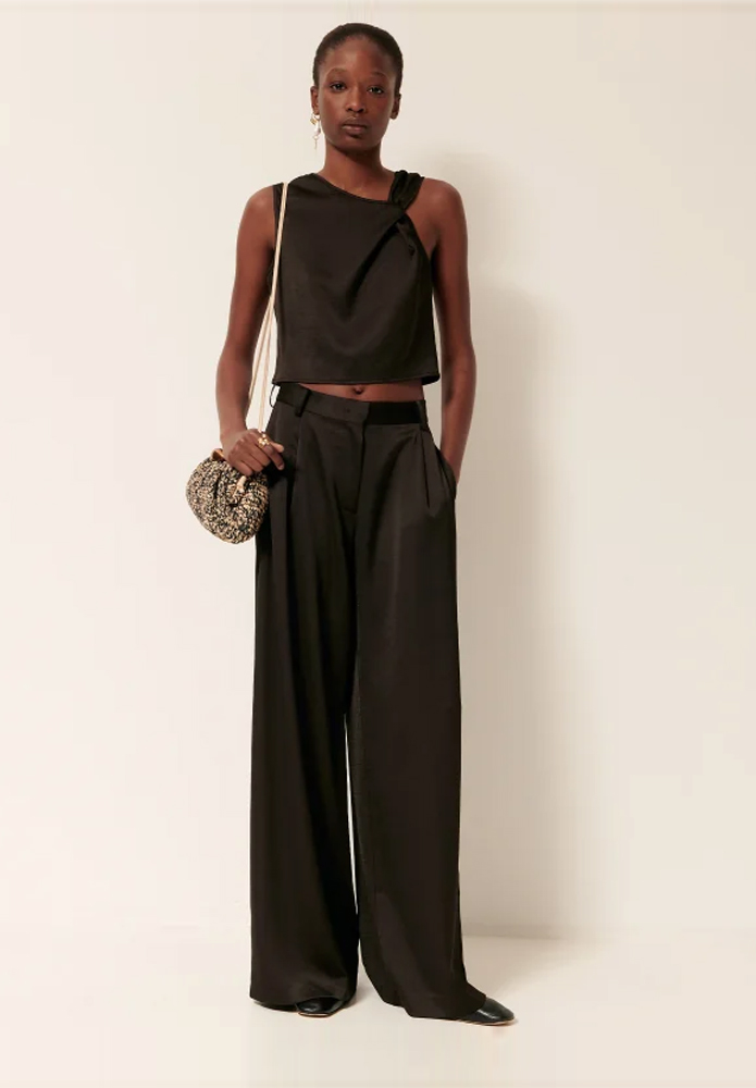Pantalón amplio en satén grueso ligeramente gofrado.