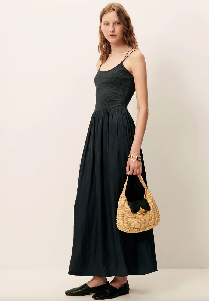 Vestido de SESSÚN largo tipo bailarina en punto fino acanalado con falda abierta en satén fluido con ligero efecto de crespón.
