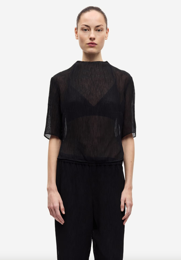 Top semitransparente de manga corta y corte regular. Cuello alto. Material principal: viscosa 100 % reciclada.