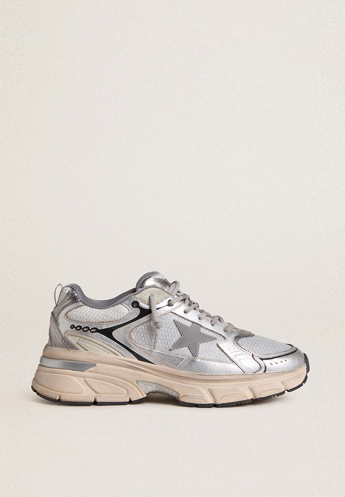 Un vistoso recuerdo del año 2000. Lightstar de GOLDEN GOOSE es un símbolo di nostalgia, con la mirada puesta en el futuro. Con sus detalles metálicos, sus aplicaciones brillantes y su suela chunky, esta zapatilla deportiva ocupa siempre el centro de la escena. Este modelo para mujer con pala de malla gris se caracteriza por su estrella de TPU gris y sus aplicaciones de napa laminada color plateado. Y como toque final, los detalles que embellecen el modelo: los cordones color gris hielo, los detalles de color negro, la etiqueta en la lengüeta con logotipo y las texturas de la malla.