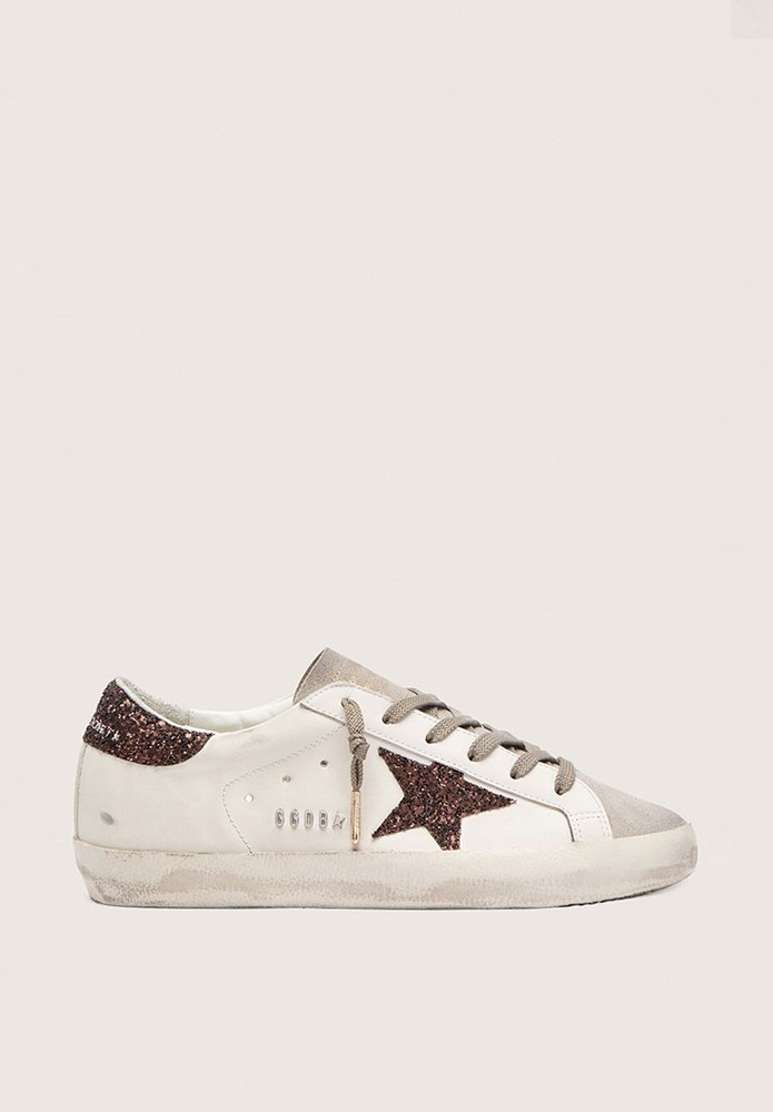 GOLDEN GOOSE crea clásicos y los renueva para realizar otros nuevos. Han elevado el diseño de estas Super-Star blancas de piel incorporando un refuerzo del talón con purpurina. Un toque de glamur que enciende su estilo.