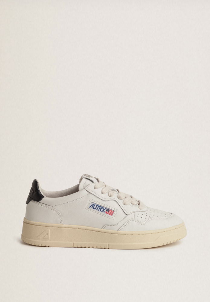 Estas zapatillas para mujer están confeccionadas en suave piel blanca de aspecto auténtico y acabadas con refuerzos de ante beige para una mezcla táctil y gráfica. El detalle de piel negra que decora el talón está personalizado con el logotipo de Autry.