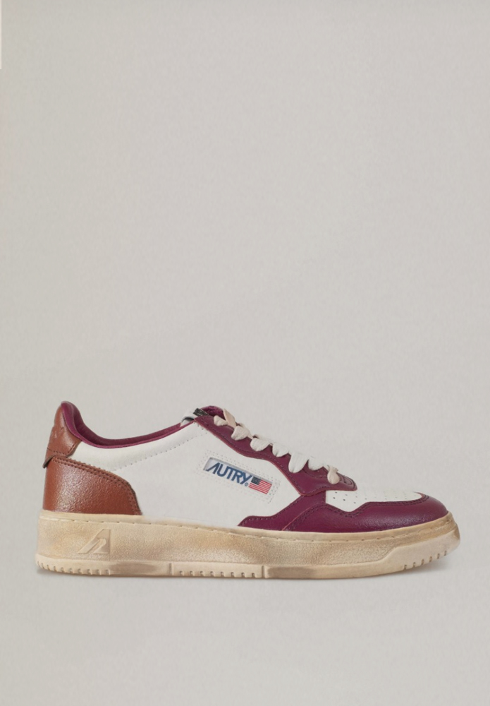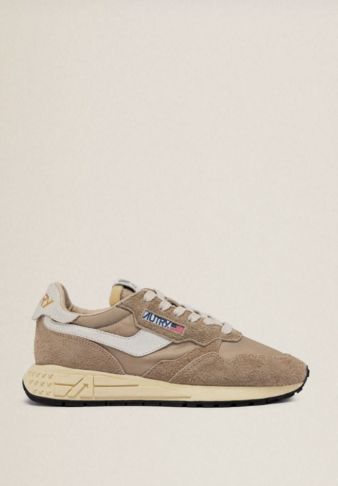 Las zapatillas deportivas Reelwind de AUTRY para mujer exploran el dinamismo callejero con una construcción en paneles que combina nailon y ante beige tono sobre tono con inserciones de piel agrietada blanca. La mezcla de colores y texturas añade contraste al perfil limpio y ligero, que descansa sobre una suela de running de Phylon blanco que aporta flexibilidad y agarre a cada paso.