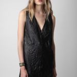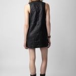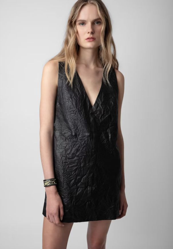 - Vestido negro corto de piel con efecto arrugado para mujer- Sin mangas, escote de pico
