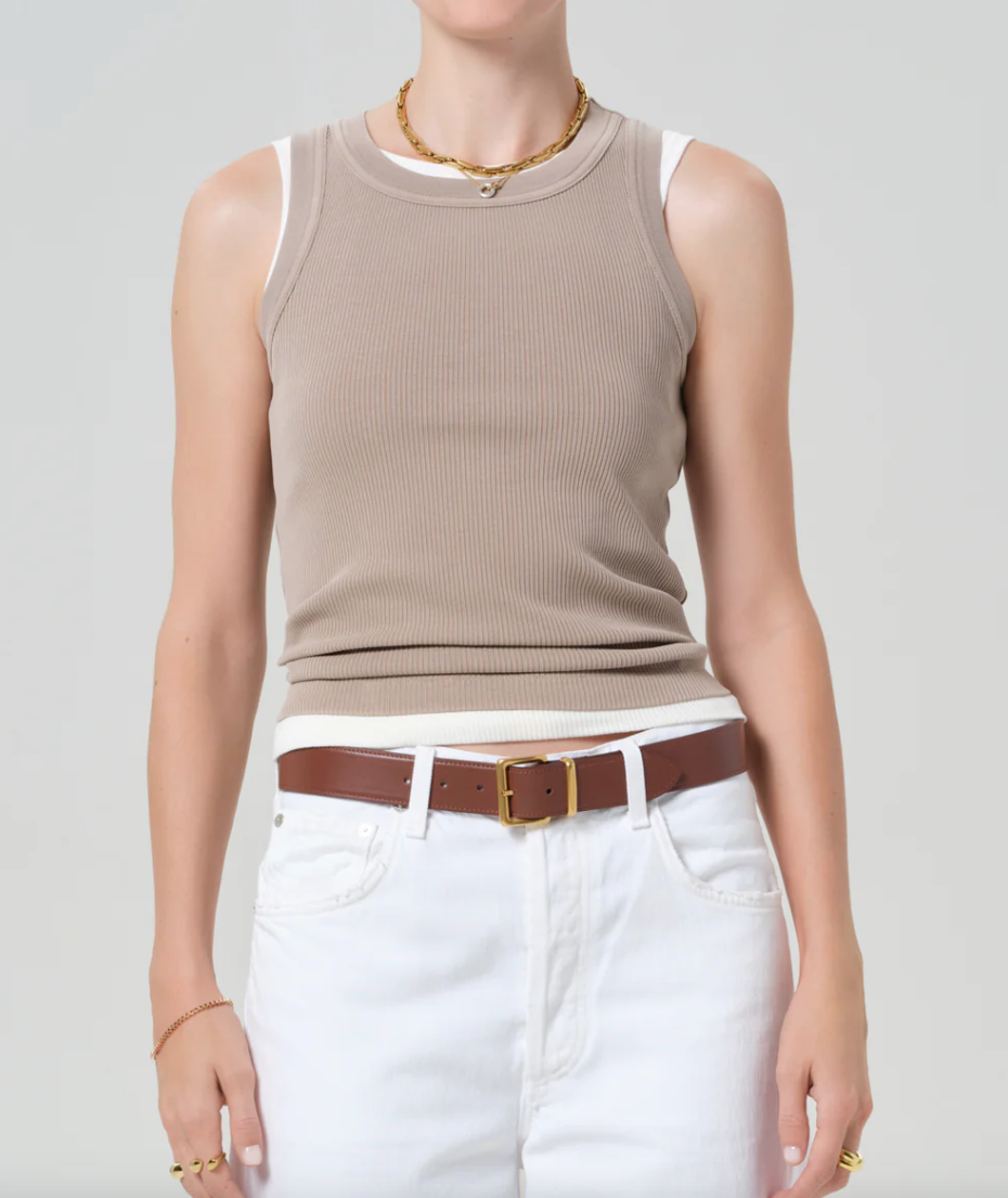 La camiseta Isabel es una prenda ajustada de punto acanalado con espalda deportiva, cuello alto y sisas abiertas.