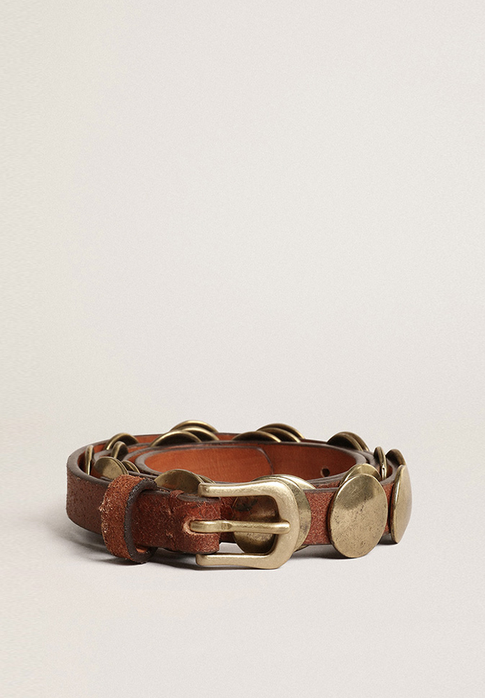 CINTURÓN BELT TRINIDAD NOUGAT Cuando la simplicidad se enriquece con detalles únicos. Este modelo Trinidad realizado en piel lavada color cuero envejecido se caracteriza por las maxitachas de color dorado con acabado galvanizado envejecido que se han aplicado en toda su longitud.