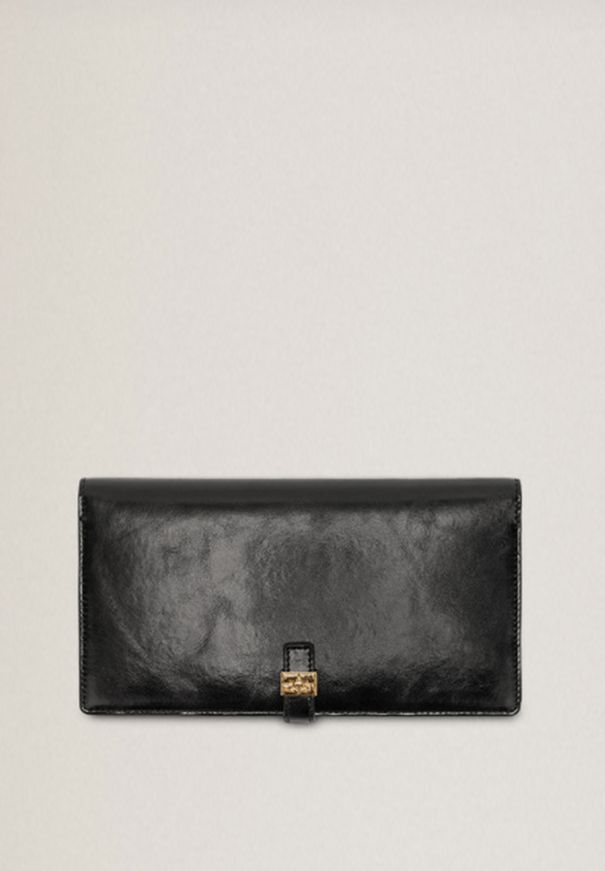 Esta cartera cuenta con cierre de solapa, logotipo GANNI Butterfly en herrajes, compartimentos para tarjetas, un bolsillo interior con cremallera y espejo.