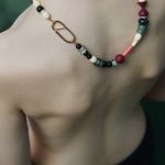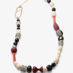 Cuentas de vidrio, cerámica, PLA y piedra en una combinación escultural. Acabado con un cierre chapado en oro. Divertidas, texturizadas y únicas.
