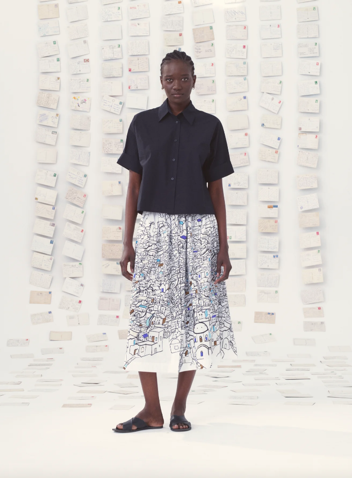 Esta falda cruzada está serigrafiada y adornada con detalles bordados a mano.