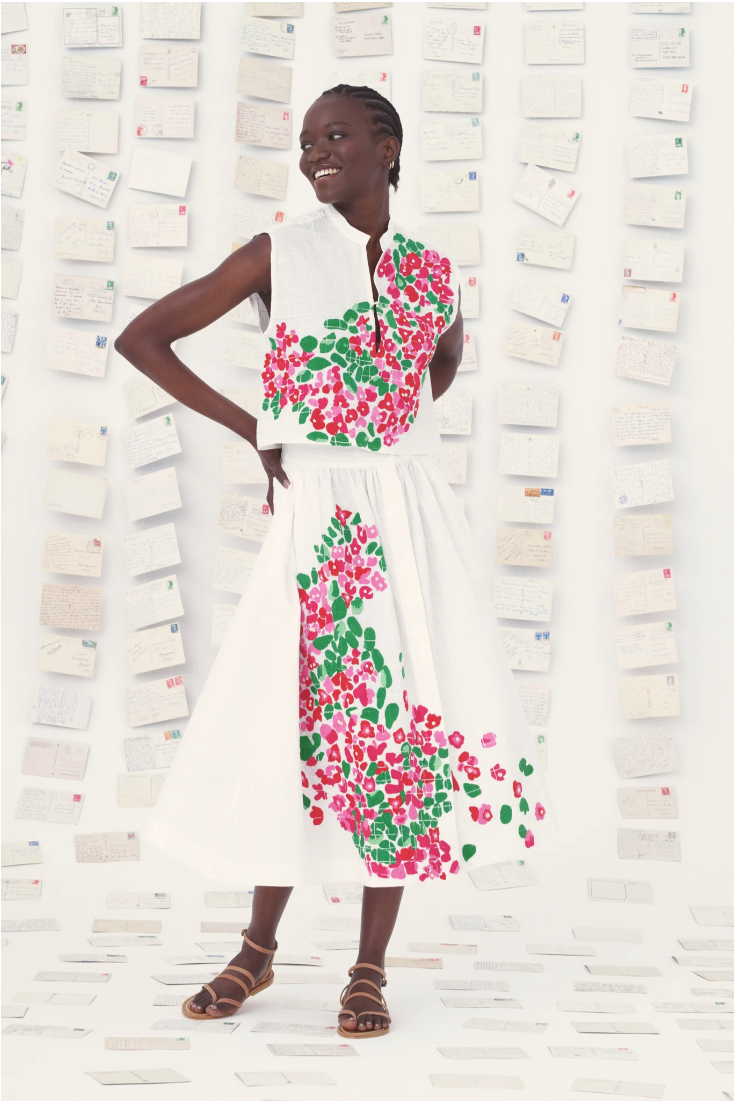 Las flores de buganvilla están bordadas a mano con hilo de algodón. Se puede combinar con el top Gaia del mismo estampado.