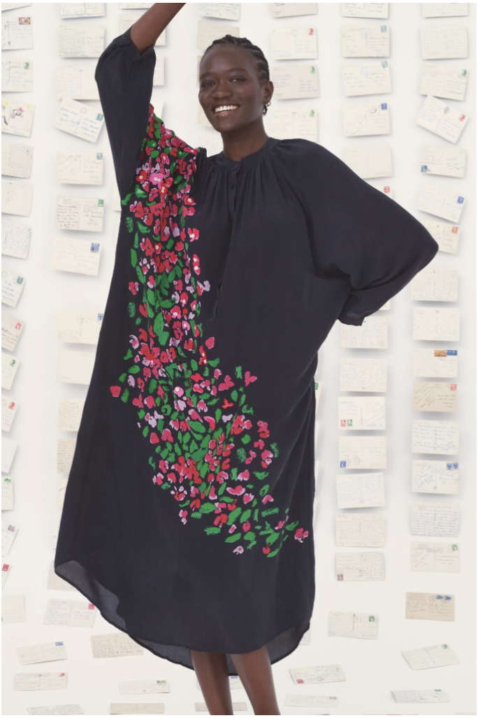 El vestido Itake de manga larga está confeccionado en delicada seda y adornado con buganvillas estampadas.Los detalles bordados a mano le aportan textura y sofisticación.Confeccionado en seda de altísima calidad, el vestido Itake en blanco roto realza sutilmente la silueta.- Vestido largo 100% seda- Forro de algodón- Fruncido en la parte delantera y trasera- Mangas raglán con aberturas resistentes al desgarro- Collar mandarín- Bolsillos laterales- Cierre de botones en el busto- Hecho en nuestro taller en India