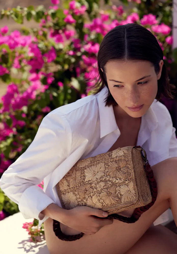 Fabricado al 100% en rafia natural con un forro de algodón, este bolso combina flexibilidad y resistencia.