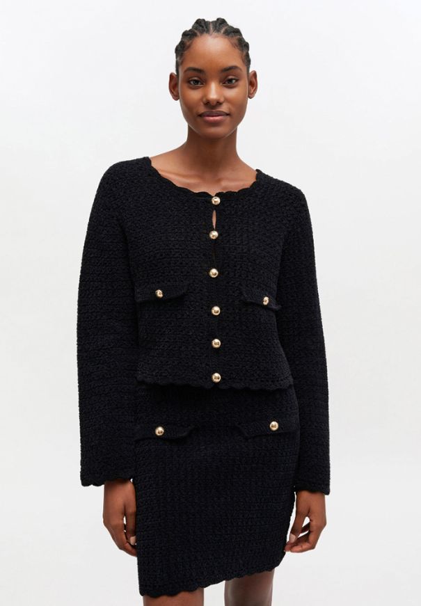 Este cárdigan de GANNI cuenta con cierre frontal de botones y dos bolsillos delanteros.