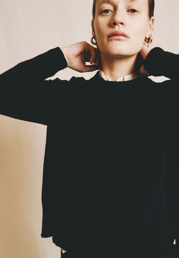 El jersey de mezcla de lana, forma parte de nuestra colección de básicos esenciales. Está diseñado para no pegarse demasiado al cuerpo, tiene cuello redondo, hombro caído y aberturas en los costados. Es más largo en la parte trasera, y tiene puños, escote y bajos rematados con rib de canalé.