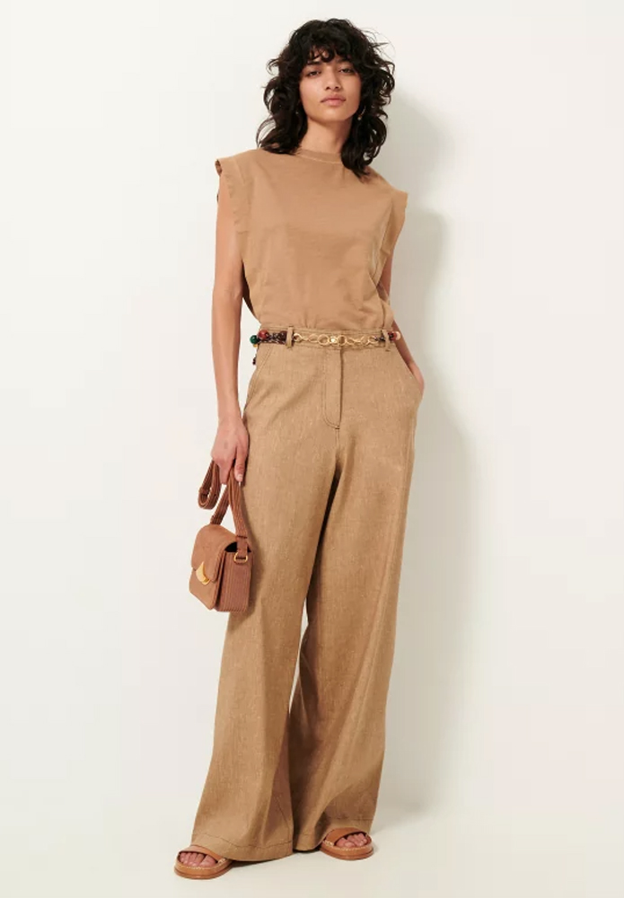 Pantalón amplio en chambray de color con hilos de lino moteados y torcidos teñidos.