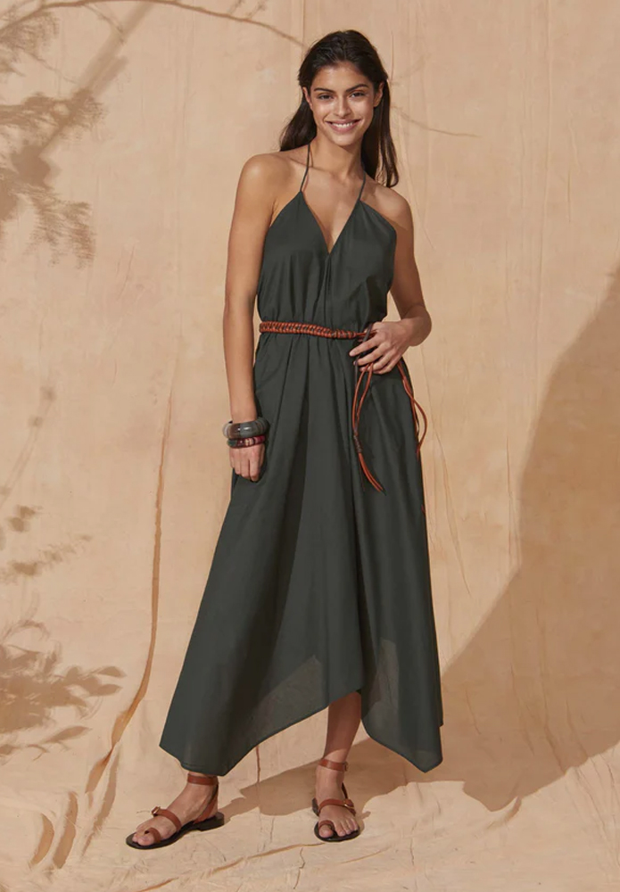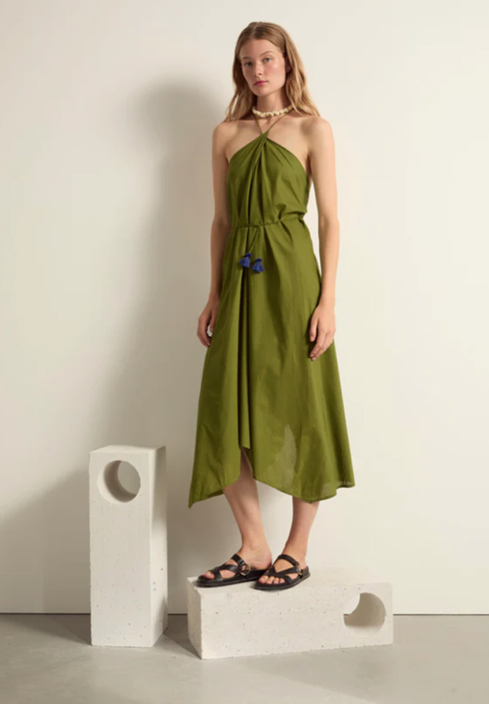VESTIDO IVINA BASICO GREEN TEA El vestido Ivina sin espalda es uno de los diseños icónicos de Mare di Latte. Sus líneas depuradas y su escote ajustable lo convierten en un vestido elegante y femenino. También disponible en seda o estampado.