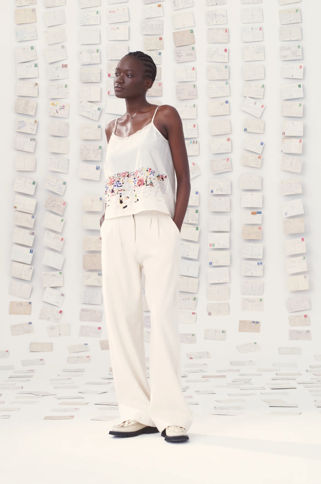 En denim crudo sin blanquear, combinan a la perfección con el top Dafni y su icónico motivo bordado, inspirado en postales de vacaciones y sus escenas veraniegas de playa.