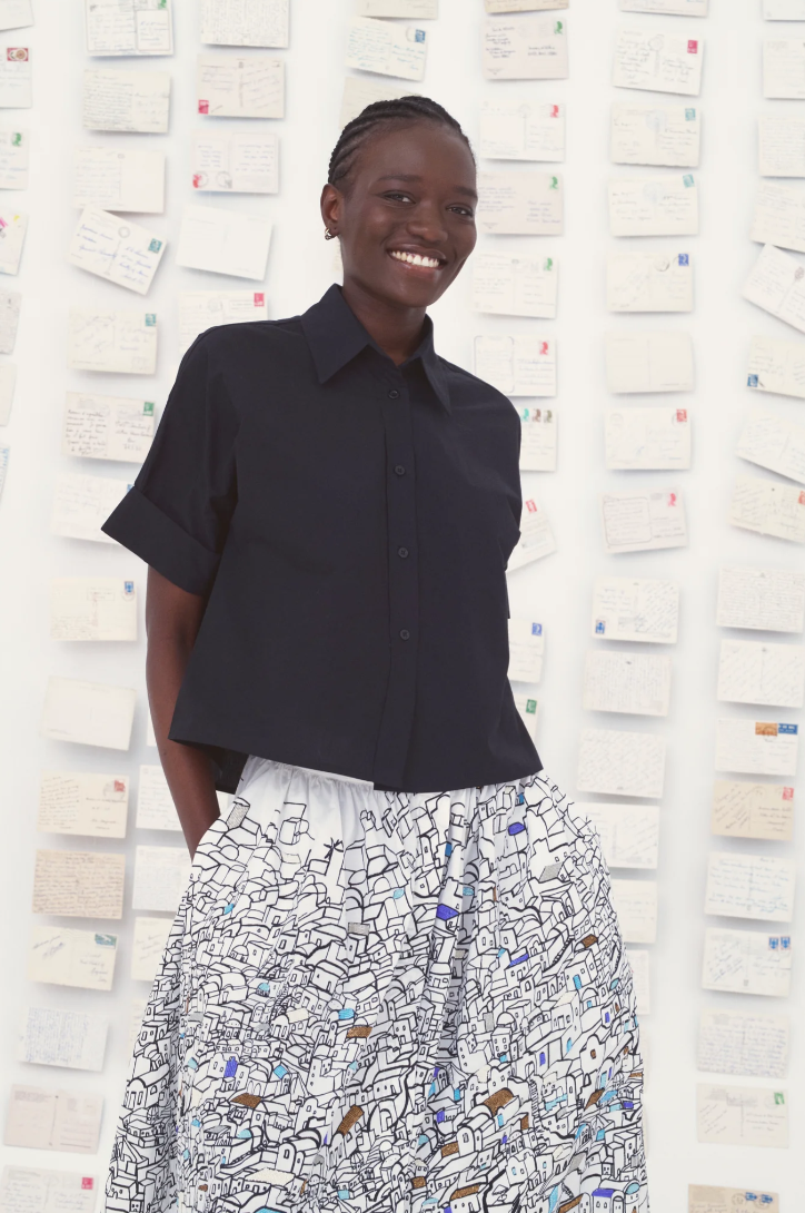 La falda Eze de MII, confeccionada en popelina de algodón, luce un estampado panorámico de la Riviera Francesa.