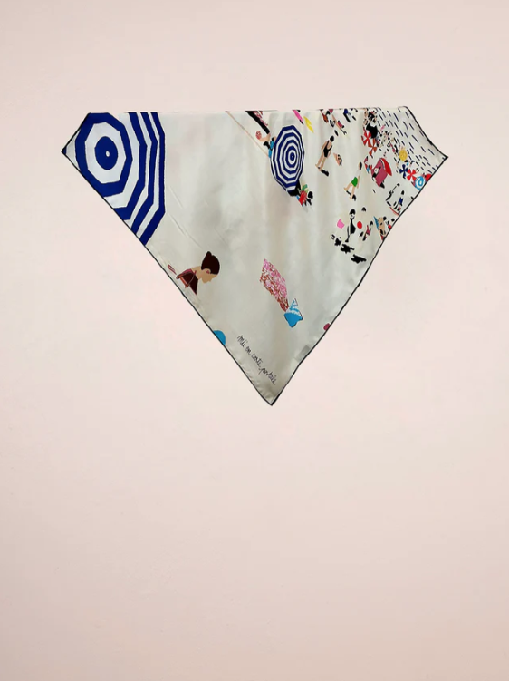 FOULARD LA PLAGE 19A Este cuadrado playero evoca la icónica imagen de las postales de vacaciones: ¡vistas de playa en verano!