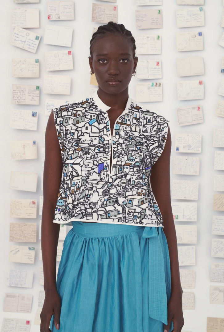 Confeccionada en lona de algodón color blanco roto, la blusa Gaia de MII cautiva con su escena de un pueblo griego bordada a mano con cuentas de vidrio.