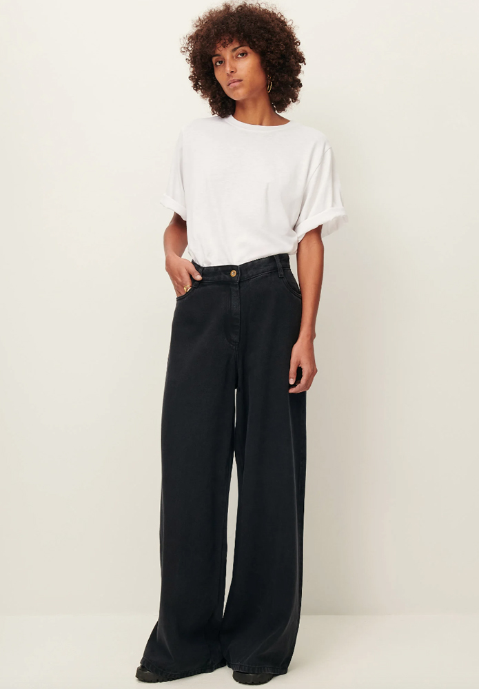 Pantalón vaquero de SESSÚN de corte amplio y cintura alta denim fluido con lavado sencillo, tejido en España.